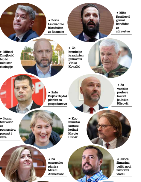 Za sektor zdravstva, u kojem SDP planira niz promjena politike i strogo odvajanje privatnog od javnog zdravstva, predsjednik SDP-a ima dva kandidata – Mišu Krstičevića ili Saru Medved, pri čemu je Krstičević puno jači kandidat jer ima i veliko iskustvo upravljanja s obzirom na to da je više mandata bio gradonačelnik Ploča. Već neko vrijeme u vezi tema branitelja istupa pukovnik u miru Vinko Kovačić, dok su u vanjskim poslovima barem dva kandidata – nekadašnji veleposlanik, prof. Ivan Grdešić te Joško Klisović koji je trenutačno slobodan na tržištu jer više nije predsjednik Gradske skupštine Zagreba, a izvorno dolazi iz MVEP-a.