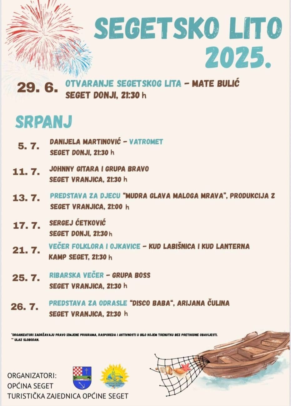 Ulaz na sve događaje je slobodan, a organizatori – Općina Seget i Turistička zajednica Općine Seget – pozivaju sve mještane i goste da ljeto provedu uz bogat kulturno-zabavni sadržaj.