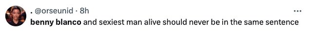 ‘Benny Blanco i najseksi muškarac na svijetu nikada ne bi trebali biti u istoj rečenici’, ubacio se netko drugi.