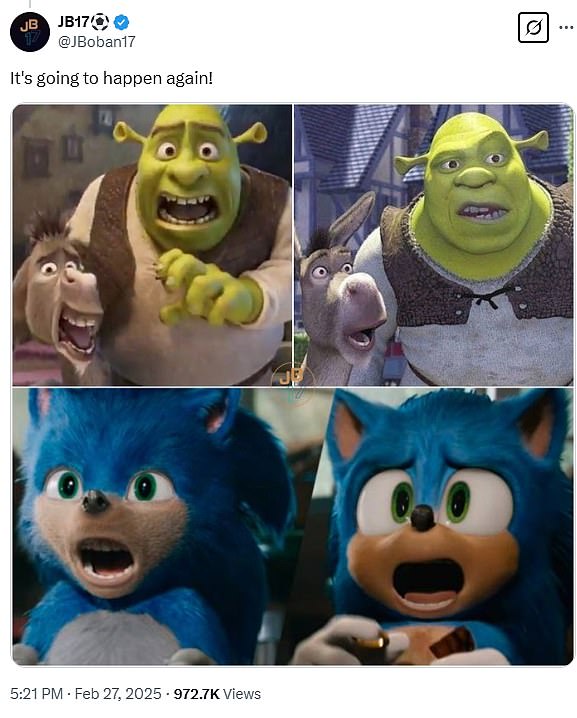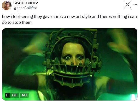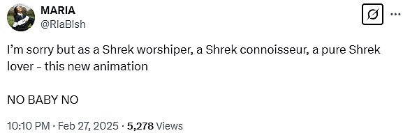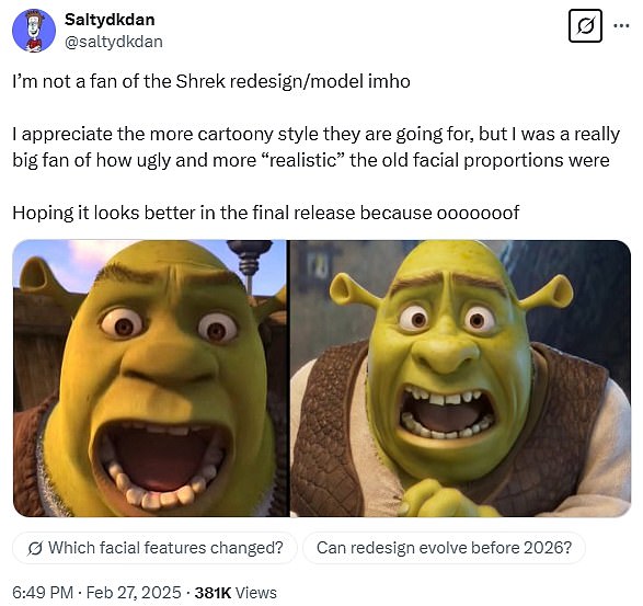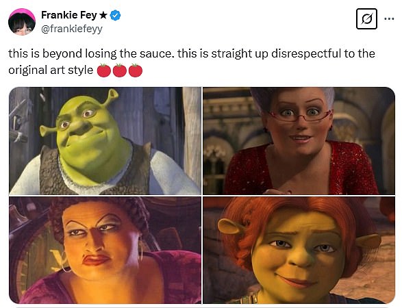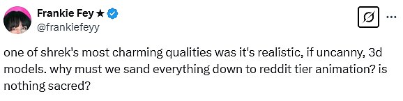 Odlazeći na društvene medije, dugogodišnji ljubitelji Shreka napisali su na X: ‘Ovo je izvan gubitka umaka. To je ravno nepoštivanju izvornog umjetničkog stila. ‘