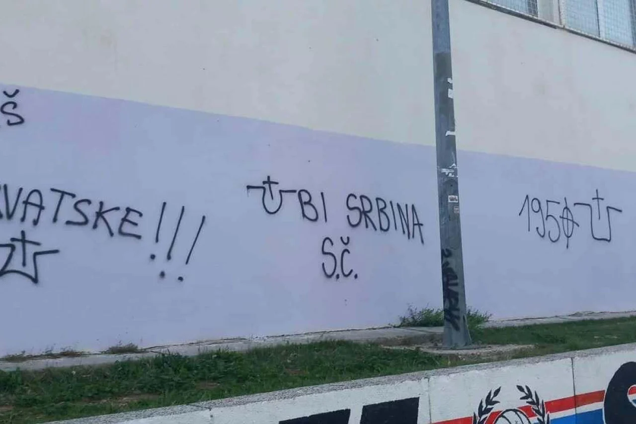 Na zgradi dvorane na Plokitama u petak su osvanuli grafiti s porukama mržnje usmjerenima prema Srbima, dok se mogu vidjeti poruke poput “Ubij Srbina”, “Mrš iz Hrvatske”, ustaško znakovlje U i slično.