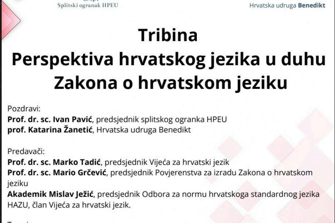 Hrvatska paneuropska unija – splitski ogranak, u suradnji s Hrvatskom udrugom Benedikt, poziva sve zainteresirane na tribinu pod naslovom “Perspektiva hrvatskog jezika u duhu Zakona o hrvatskom jeziku”, koja će se održati u četvrtak, 16. listopada 2025. godine u 19 sati u Gradskoj knjižnici Marka Marulića – Knjižnici Dalmatina (Zagrebačka ul. 4, Split). Ulaz je slobodan.