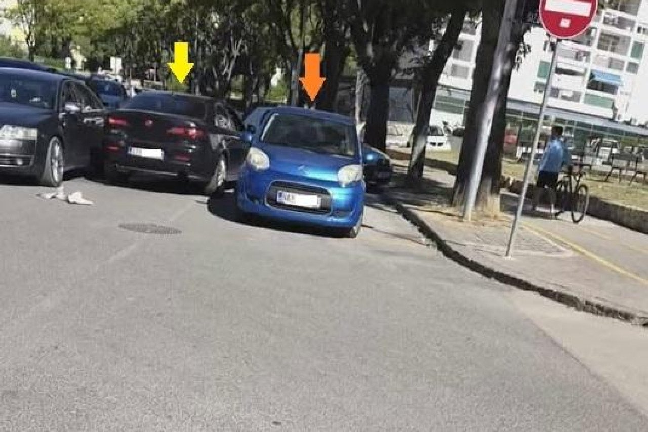 Na slici se vidi plavi automobil parkiran dijagonalno na kolniku, čime je djelomično blokirao prometnu traku, dok je crni automobil ušao u ulicu iz smjera u kojem je promet zabranjen, što potvrđuje i jasno vidljiv prometni znak ‘zabranjen smjer‘.