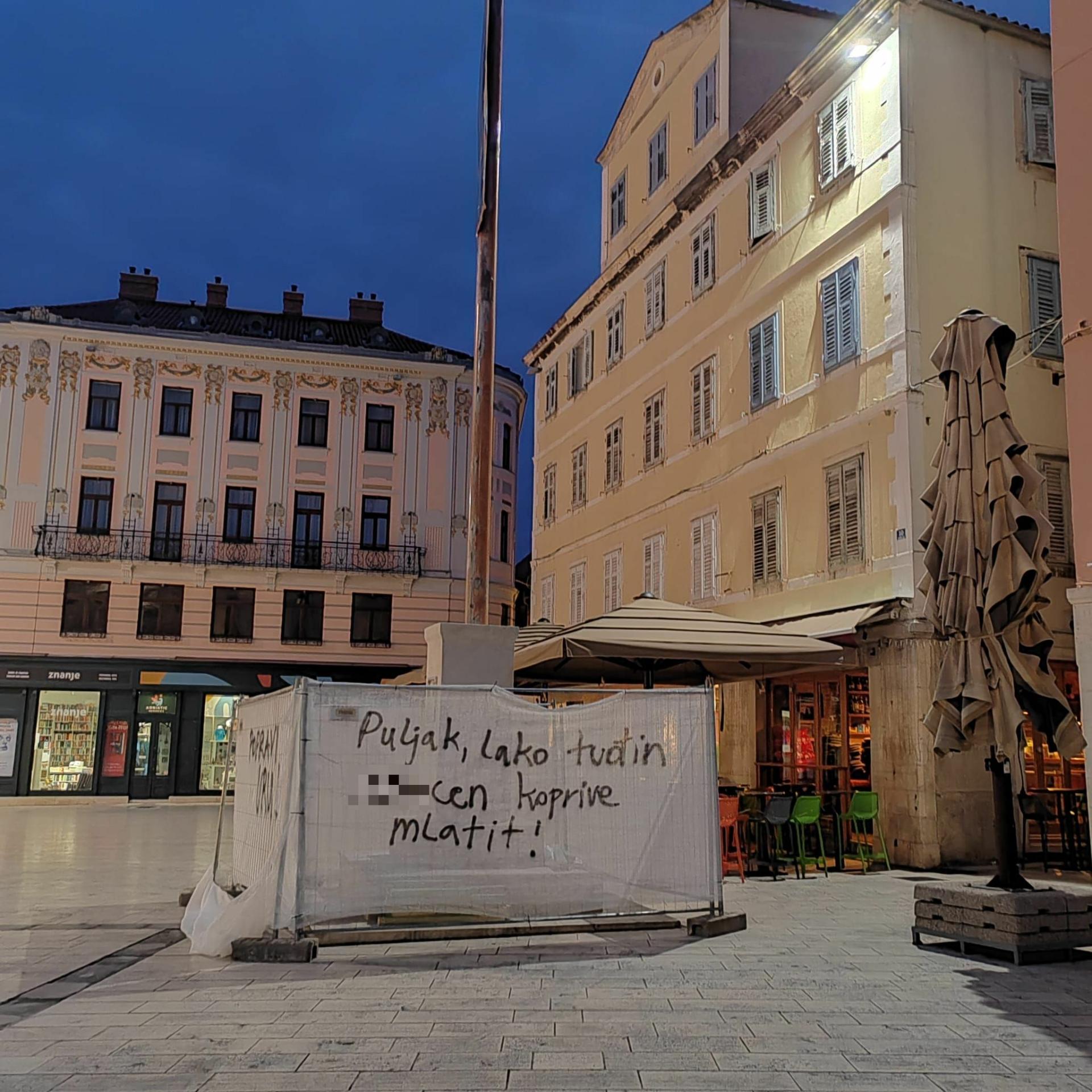 Međutim, ta gradonačelnikova odluka i hitra reakcija očito nije svima najbolje sjela. Tako je jutros rano u Facebook grupi Get getanima, koja okuplja stanare gradske jezgre, osvanula galerija fotografija na kojima se vidi kako je netko uputio gradonačelniku pogrdne riječi budući da se razbacuje gradskim novcem na štandarac, a na istoj toj Pjaci ne vidi staru uru koja vapi za obnovom i koja više ne radi nego radi.