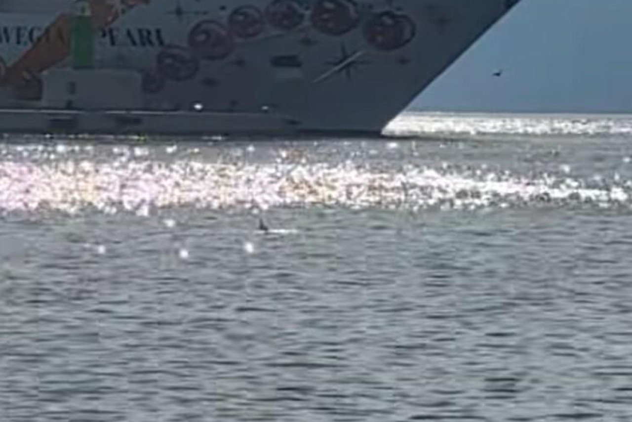 Razigrani morski gost neko je vrijeme mirno plivao uz Rivu, a zatim se približio i pramcu velikog kruzera “Norwegian Pearl”, koji je bio usidren u luci.