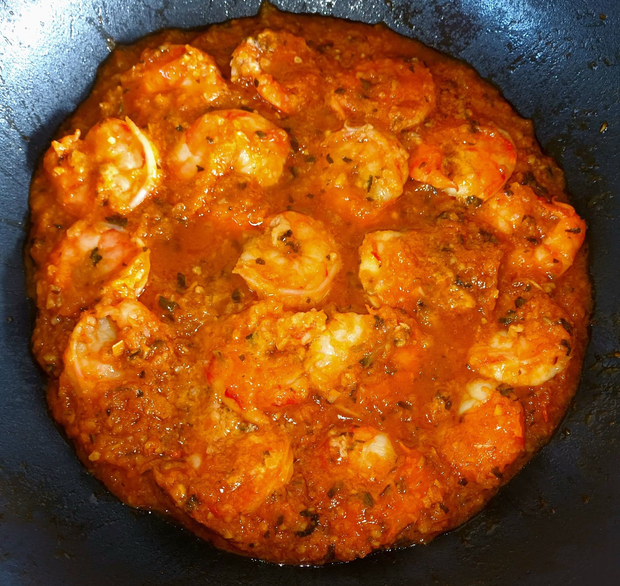 Pirjati desetak minuta, pa dodati očišcene repove kozica, oko 700 grama te nakon dvije minute uliti 1 dcl bijelog vina, kuhati još 5 minuta dok ne ispari alkohol iz vina.