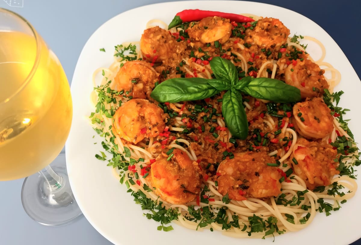Pirjati desetak minuta, pa dodati očišcene repove kozica, oko 700 grama te nakon dvije minute uliti 1 dcl bijelog vina, kuhati još 5 minuta dok ne ispari alkohol iz vina.