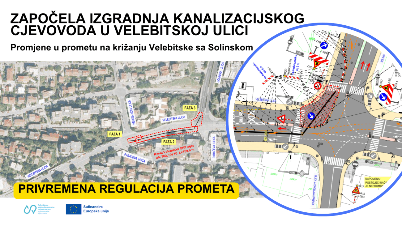 Pod okriljem Projekta poboljšanja vodno-komunalne infrastrukture aglomeracije Split – Solin koji provodi Vodovod i kanalizacija Split, u Splitu je započela izgradnja kanalizacijskog cjevovoda profila 700 mm i duljine 160 metara na sjevernoj strani Velebitske ulice. Radovi se izvode na dionici od križanja sa Solinskom ulicom do križanja s Benkovačkom ulicom, a trenutačno su u fazi 3 – na samom križanju Velebitske i Solinske ulice.