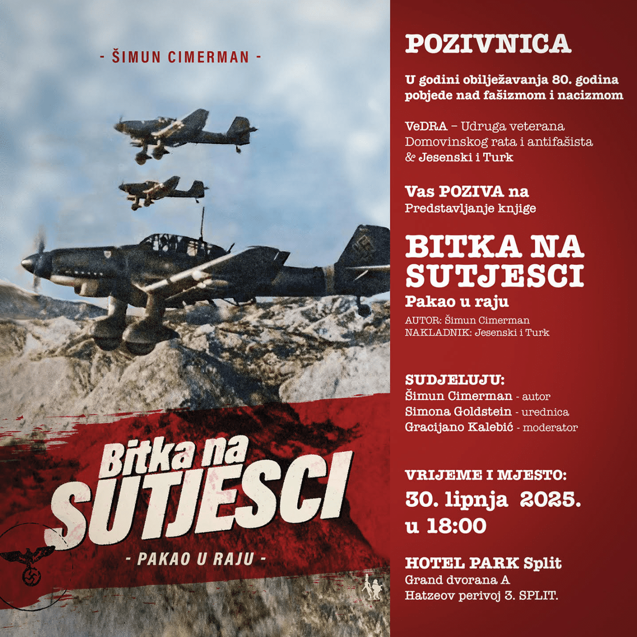 U povodu obilježavanja 80. godišnjice pobjede nad fašizmom i nacizmom, u Splitu će se 30. lipnja 2025. godine održati promocija knjige “Bitka na Sutjesci – Pakao u raju” autora Šimuna Cimermana. Predstavljanje knjige počet će u 18:00 sati u Grand dvorani A hotela Park, na adresi Hatzeov perivoj 3.