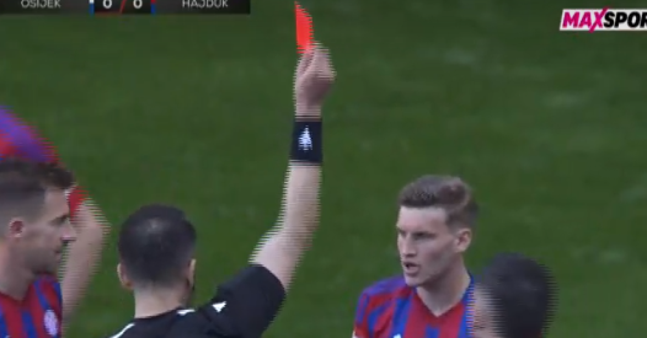 Mladi napadač Hajduka na Opus Areni je isključen već u 30. minuti, nakon što je dvaput, u razmaku od sedam minuta, žestoko startao na Osijekova beka Renana Guedesa i zaradio žute kartone, tako da će Osijek dvije trećine utakmice imati igrača više, dok će gosti, jasno, biti u igračkom deficitu. U utakmici u kojoj moraju ganjati pobjedu ako žele ostati u utrci za naslov prvaka.