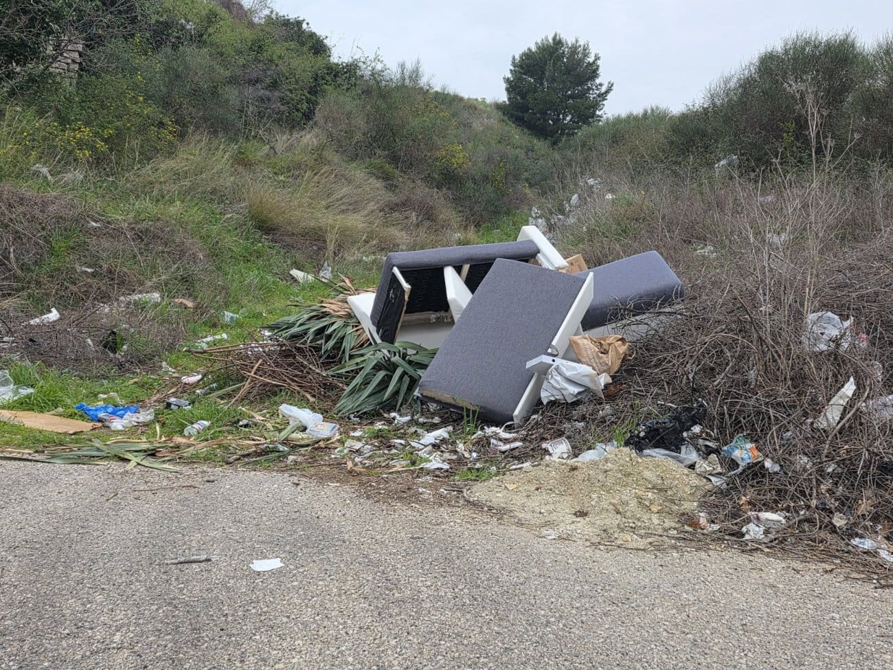 Na fotografiji se uz rub ceste i u šikaru vidi odbačen komad namještaja – dijelovi tapeciranog namještaja s tamnosivim naslonima i bijelim elementima – uz razbacane vrećice, ambalažu i sitni otpad. Uz to su vidljive i odbačene grane te biljni otpad, a sve zajedno ostavlja dojam improviziranog divljeg odlagališta na zelenoj površini.