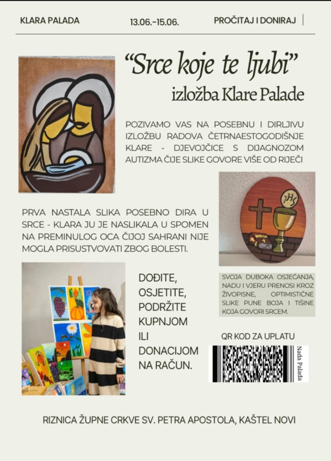 “Srce koje te ljubi” naziv je izložbe Kaštelanke Klare Palade koja ima samo četrnaest godina. Klara je djevojčica s dijagnozom autizma, a nakon prošlogodišnje izložbe pod nazivom “Utočište na platnu”, ova mlada umjetnica izlaže svoje radove i ovoga petka 13. lipnja u Riznici župne crkve sv. Petra Apostola u Kaštel Novom, iza svete mise u 19 sati.