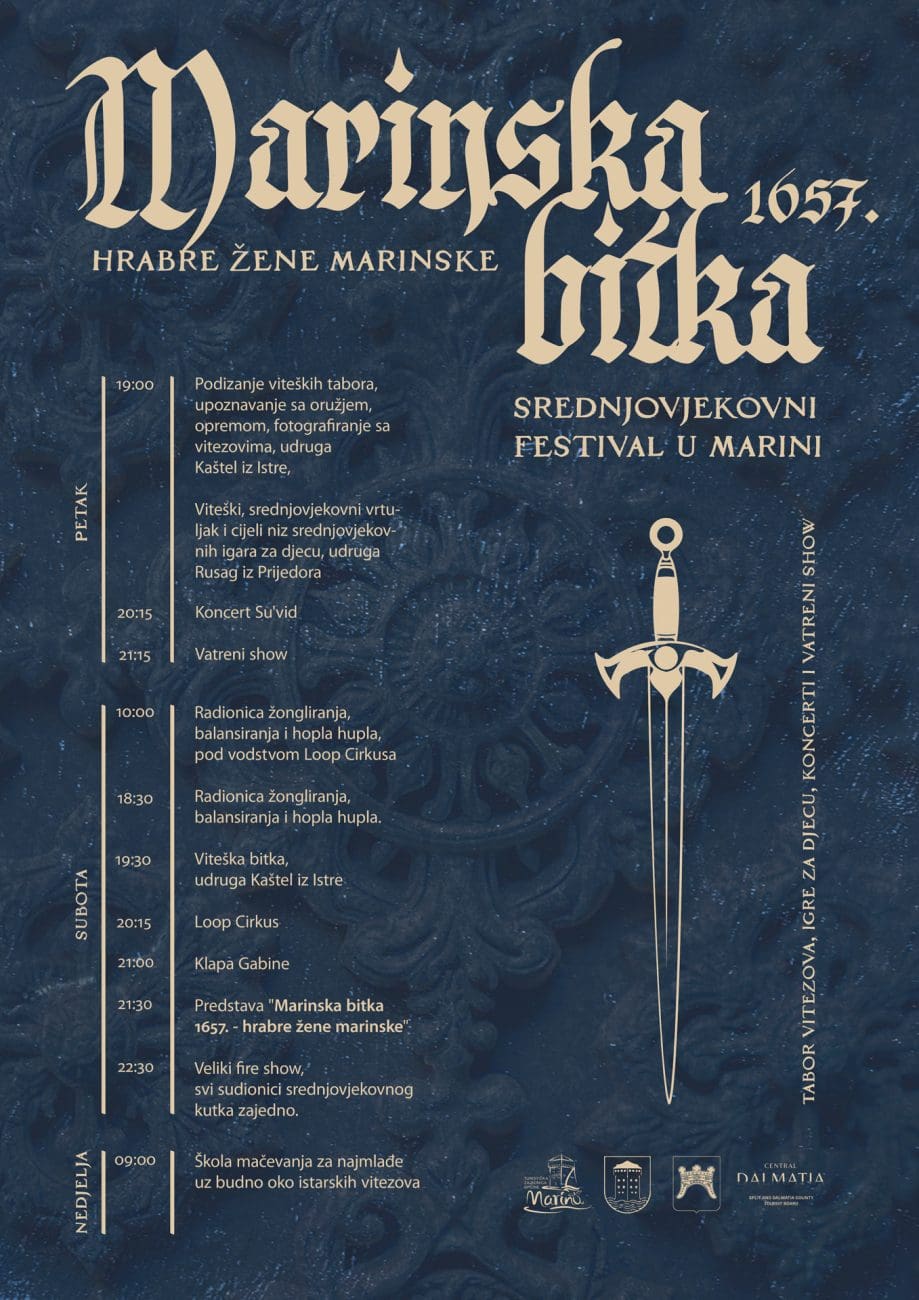Marina će ovog vikenda, od 11. do 13. srpnja, ponovno postati središte povijesti, vitezova i spektakla – sve u sklopu tradicionalnog Srednjovjekovnog festivala koji svake godine privlači brojne posjetitelje. Vrhunac programa bit će u subotu navečer, kada se održava povijesno-scenska predstava “Marinska bitka 1657. – Hrabre žene Marinske”.