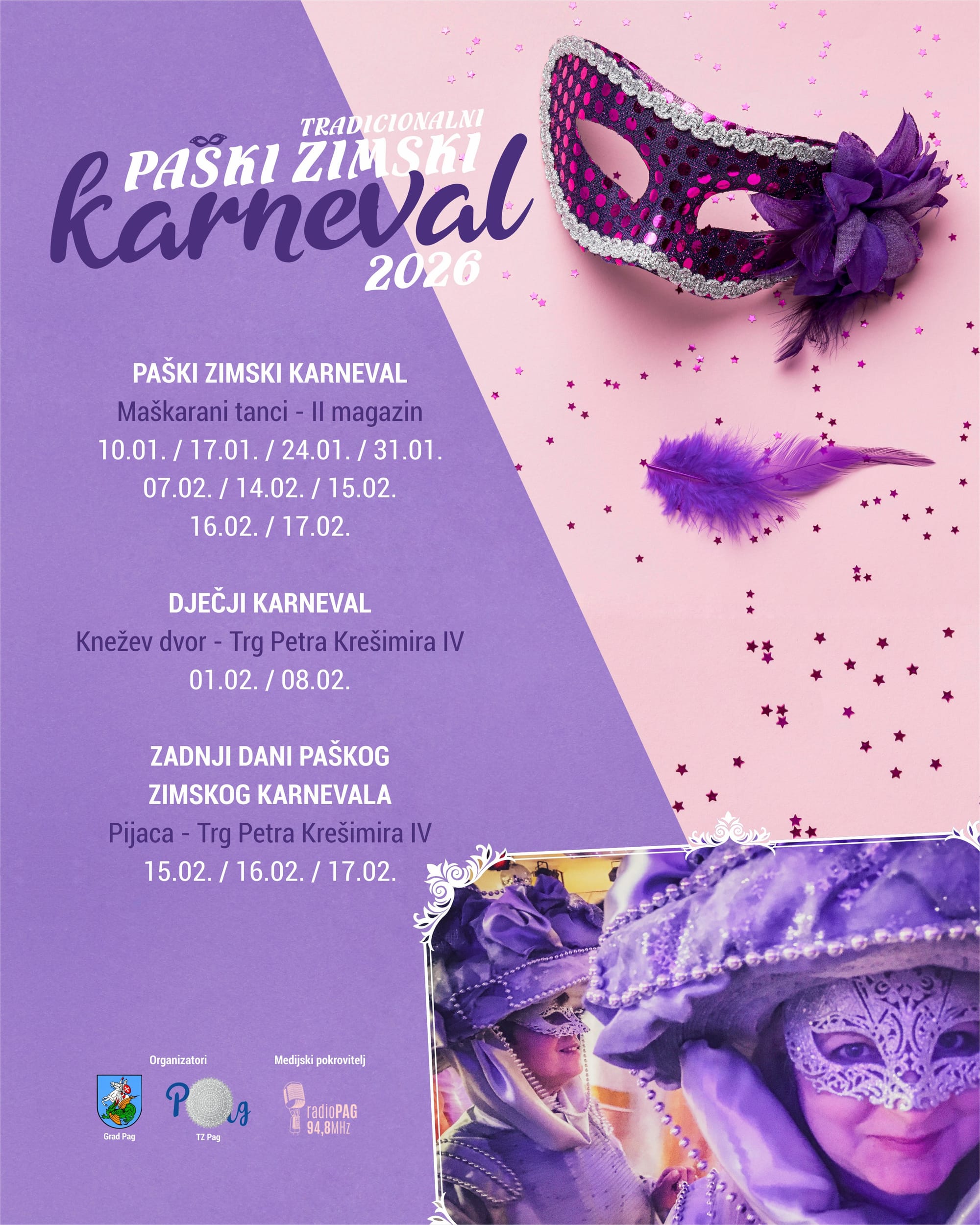 Paški zimski karneval njeguje dugu tradiciju maškaranja, druženja i veselja, a ove godine donosi bogat i šaren program ispunjen glazbom, plesom, zabavom za djecu i završnim danima karnevala.Karneval počinje u subotu, 10. siječnja, socijima u Kneževom dvoru, od 19:00 do 21:00 sati, kada će se održati izbor princa karnevala. Nakon socija, program se nastavlja prvim maškaranim tancima u II magazinu uz nastup Grupe Vigor.