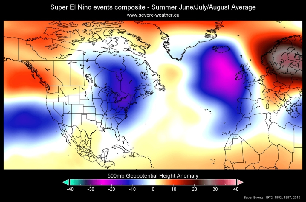 Očekuje se da će El Niño početi utjecati na atmosferu do ljeta 2026. godine. Povijesni podaci za ljeta tijekom Super El Niña pokazuju tendenciju stvaranja područja niskog tlaka zraka iznad istočnih dijelova SAD-a i Kanade te uz zapadnu obalu Europe. To podržava sjeverniji protok zraka i umjerenije ljetne temperature u Sjevernoj Americi. Najnovije prognoze za ljeto 2026. pokazuju vrlo sličan obrazac tlaka.