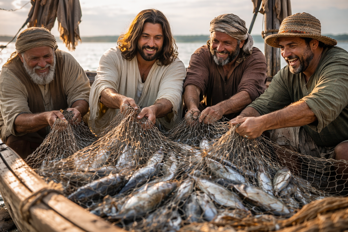 Na sjeveroistočnoj obali Galilejskog jezera, u blizini užurbanog Kafarnauma, svakodnevica je mirisala na sol i vlagu. Braća Šimun i Andrija bili su usred posla, bacajući mreže u plićak, dok su nešto dalje Jakov i Ivan sa svojim ocem Zebedejem krpali poderane konope.