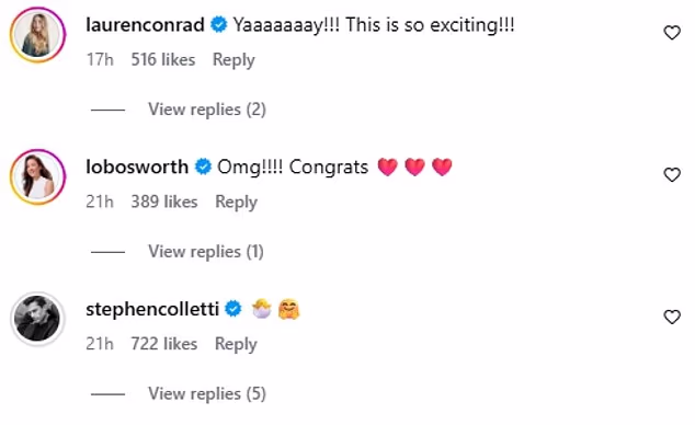 Među onima koji su poželjeli dobre želje bila je i Lauren ‘Lo’ Bosworth, 39, koja je komentirala: ‘Omg!!!! Čestitamo,’ uz tri emotikona crvena srca.