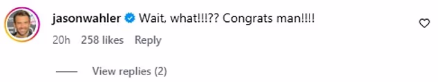 Jason Wahler (39), koji je otac troje djece sa suprugom Ashley, bio je šokiran viješću svog prijatelja Stephena komentirajući: ‘Čekaj, što!!!?? Svaka čast čovječe!!!!’