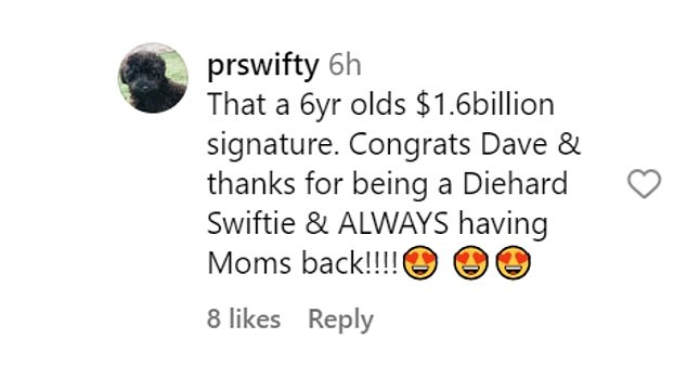 ‘To je potpis šestogodišnjaka vrijedan 1,6 milijardi dolara’, rekao je obožavatelj. ‘Čestitam Dave i hvala što si Diehard Swiftie i UVIJEK imaš mame natrag!!!’