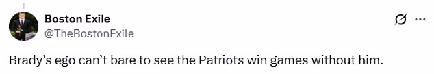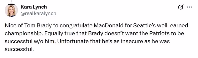 Jedan je napisao na X: ‘Lijepo od Toma Bradyja što je čestitao MacDonaldu na dobro zasluženom prvenstvu Seattlea. Jednako je istina da Brady ne želi da Patriotsi budu uspješni bez njega. Šteta što je nesiguran koliko je bio uspješan.’