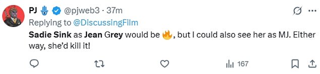 ‘Vidim citate i odgovore, a Firestar je također prilično cool izbor za Sadie Sink. Bio bih prilično uzbuđen da je tako’, priznao je obožavatelj.