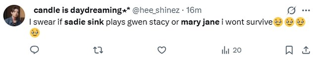 ‘Kunem se da neću preživjeti ako Sadie Sink bude glumila Gwen Stacy ili Mary Jane’, našalio se obožavatelj.