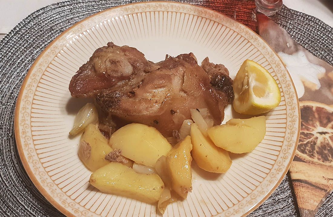 U međuvremenu očistimo patate (oko 0.3 kg po osobi) posolimo ih i začinimo s grančicom ružmarina, stavimo dvije glavice luka prerezane popola.