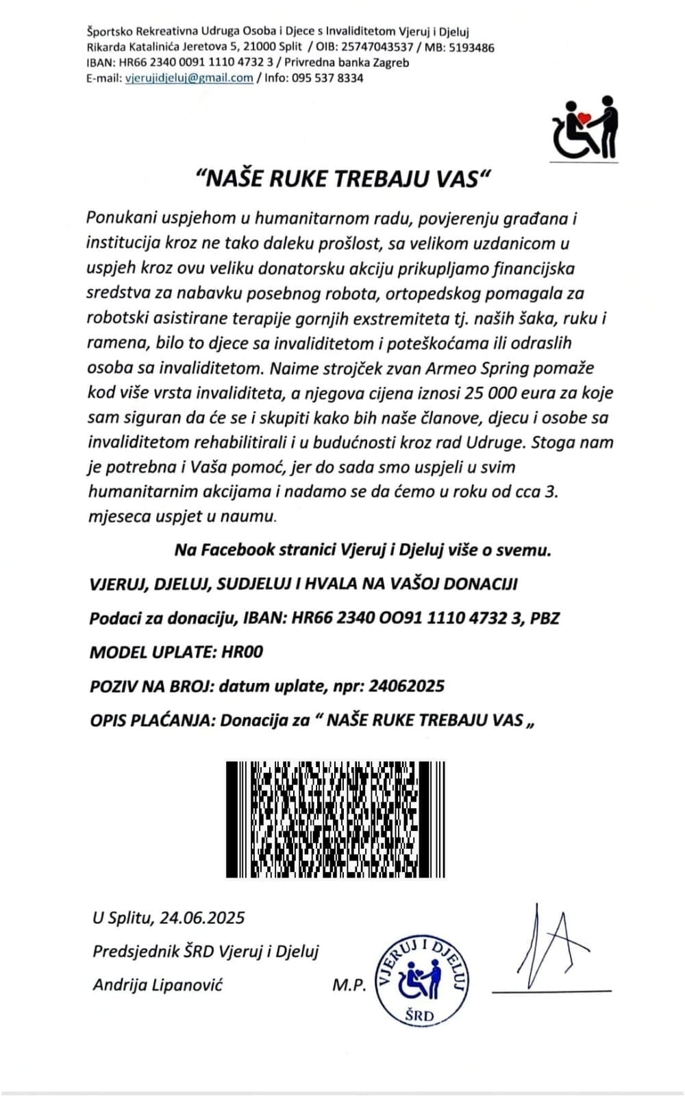 Cilj akcije “Naše ruke trebaju vas” je prikupiti preostalih 15.000 eura od ukupno potrebnih 25.000 eura, koliko košta ovaj sofisticirani aparat koji bi pomogao i djeci s otoka Visa – dvije djevojčice, tri dječaka, i među njima i mali Andrija – da dobiju šansu za kvalitetniju rehabilitaciju.