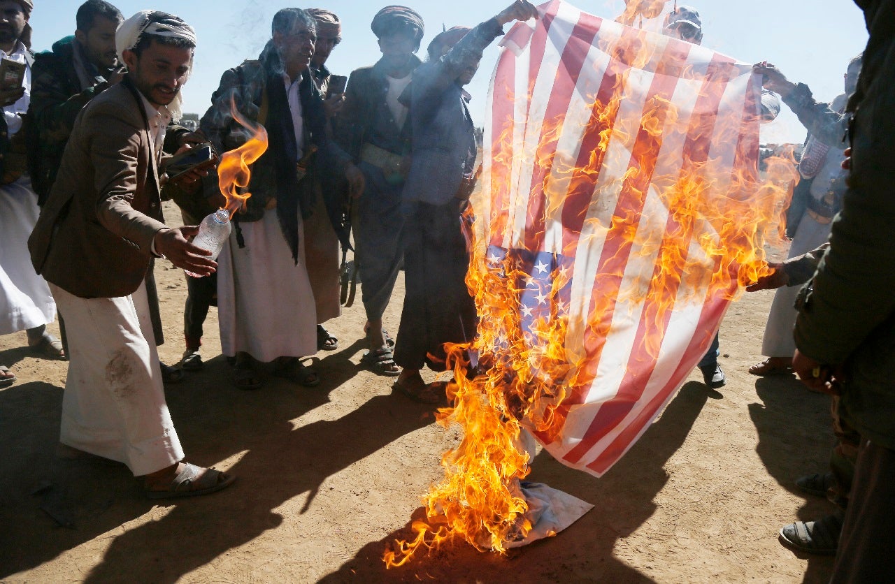 Houthi sljedbenici spaljuju izraelske i američke zastave tijekom plemenskog okupljanja 14. siječnja 2024. na periferiji Sana’a, Jemen. Houthi sljedbenici okupili su se kako bi prosvjedovali protiv zračnih napada u SAD-UK-u na pozicijama u područjima pod njihovom kontrolom. (Mohammed Hamoud/Getty Images)