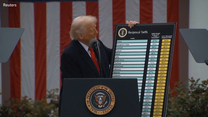 Američki predsjednik Donald Trump donio je veliku ljestvicu na pozornici tijekom svoje najave “Dan oslobađanja” kako bi iznio njegov plan recipročne tarife.