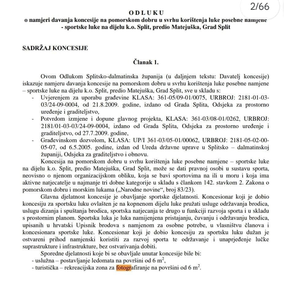 Tek dva mjeseca prije, Grad Split je objavio Odluku o namjeri davanja koncesije na pomorskom dobru u svrhu korištenja luke posebne namjene – sportske luke na dijelu k.o. Split, predio Matejuška.