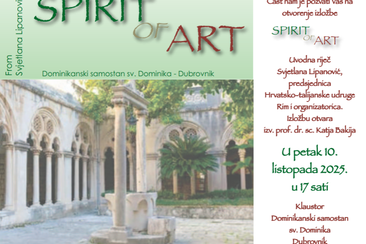 U prekrasnom klaustoru Dominikanskog samostana sv. Dominika iz XIV. st. u Dubrovniku otvorit će se 10. listopada 2025. godine međunarodna izložba “Spirit of Art” . Izložbu je organizirala Svjetlana Lipanović, kustosica i predsjednica Hrvatsko-talijanske udruge – Rim.