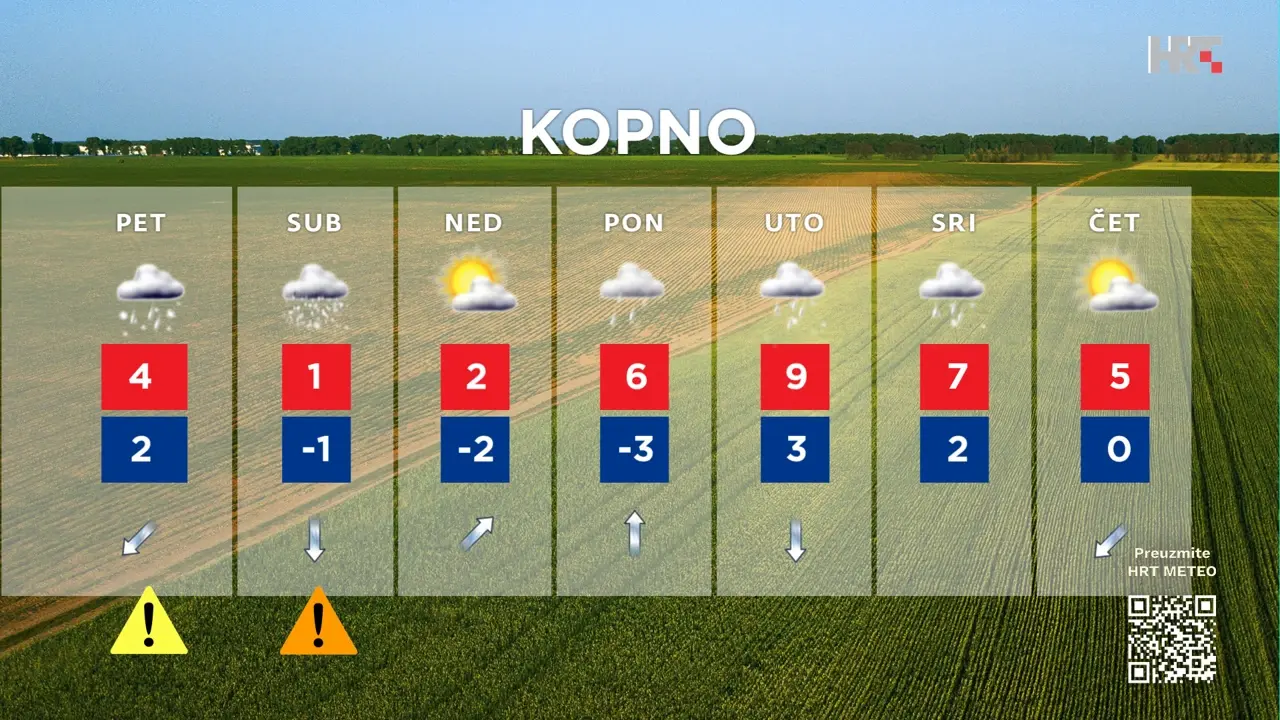 U Hrvatsku je stiglo dugo najavljivano zahlađenje. Meteorologinja Katarina Katušić iz DHMZ-a rekla je za HRT kako že subota na istoku Hrvatske biti oblačna i hladna, uz temperaturu između -1 i 2 °C. “Puhat će umjeren sjeverozapadnjak. Osobito će poslijepodne padati susnježica i snijeg, uz stvaranje snježnog pokrivača”, dodala je. “I u središnjoj Hrvatskoj snijeg, pri čemu je deblji snježni pokrivač, osim u gorju, moguć i na jugu područja. Uz izostanak znatnog dnevnog hoda temperature bit će hladno, uz dodatan osjet hladnoće zbog umjerenog, na udare i jakog sjevernog i sjeveroistočnog vjetra.