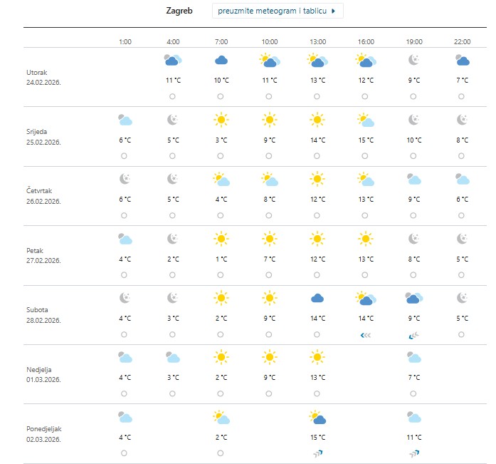 Danas će u Hrvatskoj biti dosta oblačno, danju svježije, a mjestimice može pasti malo kiše i tu uglavnom prijepodne, u unutrašnjosti. U nastavku tjedna sve toplije, uz ugodne dnevne temperature koje se mogu penjati i do 20 °C, što je svakako iznad prosjeka za ovo doba godine.