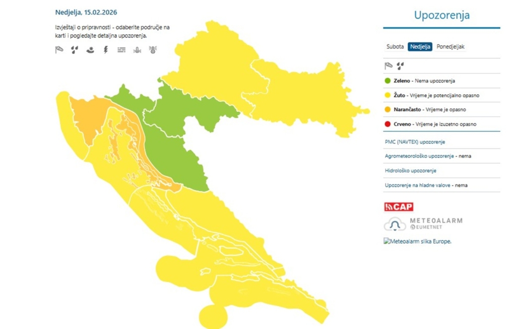 Za dio Hrvatske objavljeni su meteoalarmi. U kninskoj, riječkoj, splitskoj i dubrovačkoj regiji upozorenje je zbog jakog i olujnog juga te obilne kiše i pljuskova s grmljavinom. Jako jugo probleme će raditi duž cijele obale.
