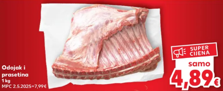 Za blagdanski obiteljski ručak tu je i odojak po cijeni od 4,89 eura za kilogram. U kratkotrajnoj ponudi nalazi se i pečenica 100 grama po cijeni od 1,79 eura te Gavrilović kulenova seka 100 grama za 1,44 eura. Mješano mljeveno meso je 4,89 eura za 800 grama, a kilogram svinjskog file je 6,45 eura.