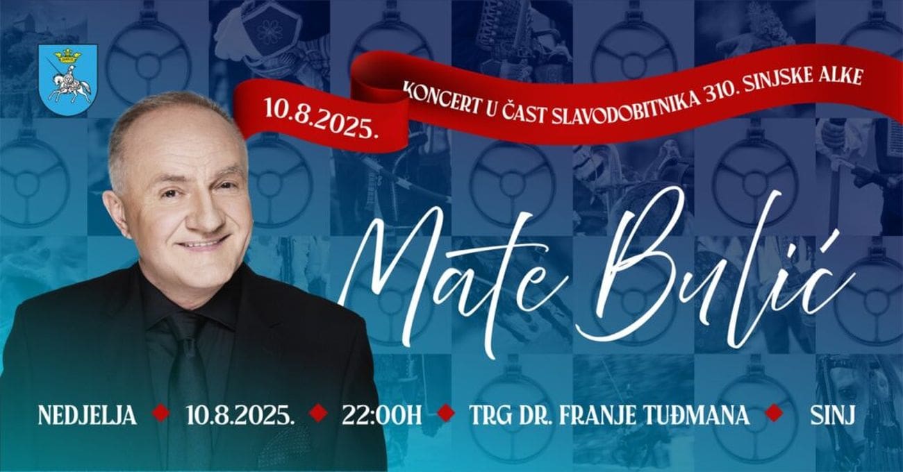 U čast slavodobitnika 310. Sinjske alke, na Trgu dr. Franje Tuđmana, održat će se veliki koncert legendarnog Mate Bulića glazbenog simbola hrvatske dijaspore i domoljublja.