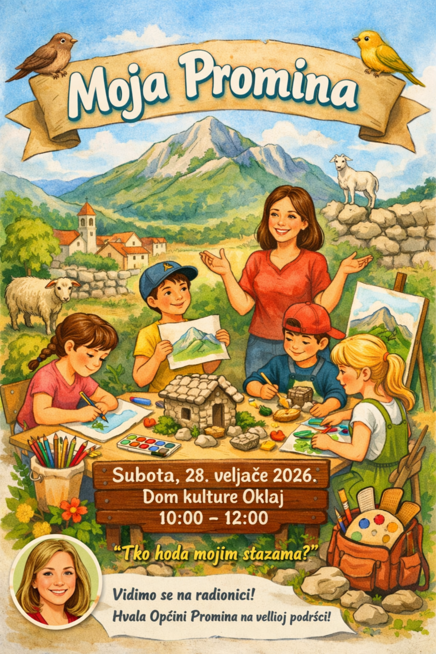 U subotu, 28. veljače 2026., od 10 do 12 sati u Domu kulture u Oklaju održat će se prva dječja radionica pod nazivom “Moja Promina”. Radionicu vodi Anđela Paklar, a namijenjena je svoj djeci s područja Općine Promina.