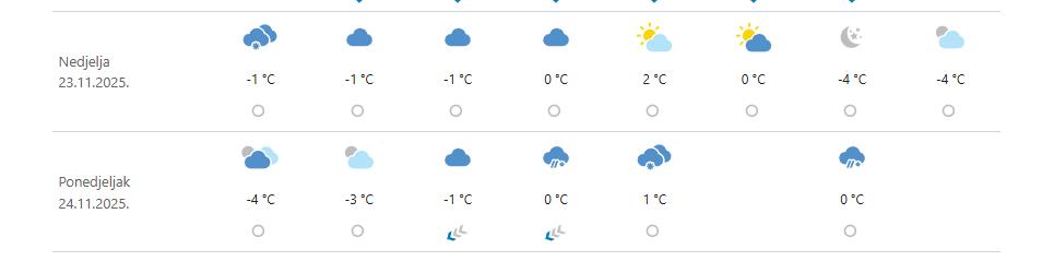 U nedjelju se očekuje razvedravanje pa će najviše dnevne temperature na kopnu spustiti i iznositi od 0-3 stupnja. Mogućnost snijega postoji i početkom sljedećeg tjedna – i to u zagrebačkoj, karlovačkoj, gospićkoj, kninskoj, osječkoj i riječkoj regiji. Nakon snijega slijedi još jedno iznenađenje a to je sunčano razdoblje, ali i dodano niže temperature koje ići do -4°C.