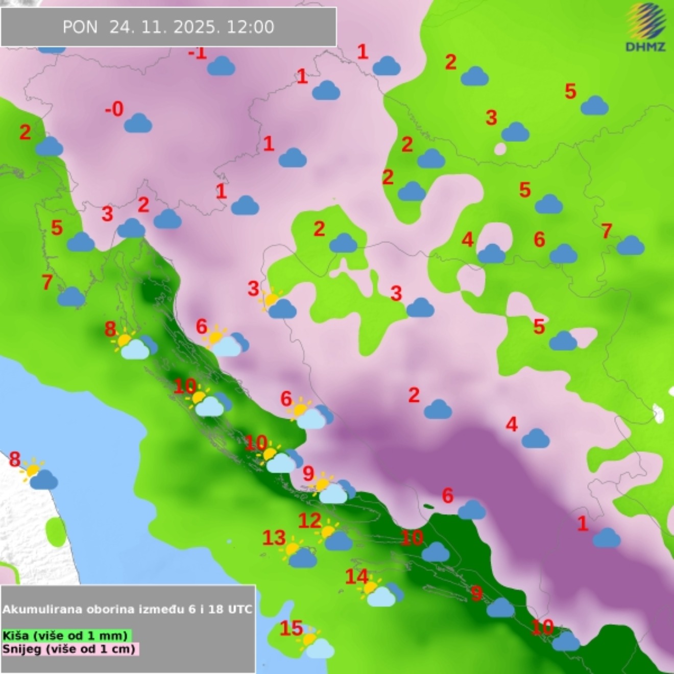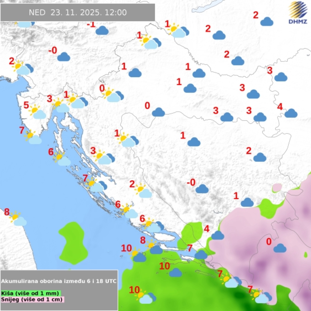 Vjetar će na kopnu biti većinom slab, dok će na Jadranu puhati slaba do umjerena bura, a prema kraju dana jugo i južni vjetar. Najviša dnevna temperatura između 6 i 11, a na obali od 12 do 17 °C, kažu iz DHMZ-a.