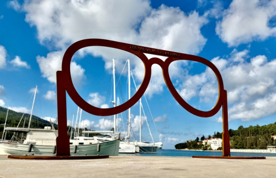 Instalacija u obliku stiliziranih naočala, kakve je Oliver nosio na početku svoje karijere, podignuta je uz samo more, na lokaciji s koje se pruža pogled na velolučku uvalu i otočić Ošjak.