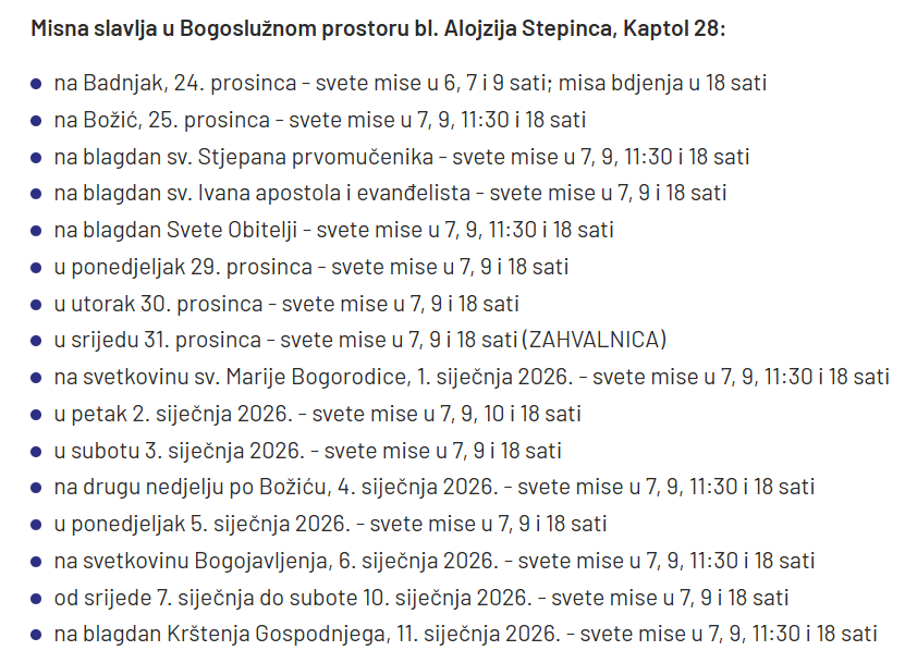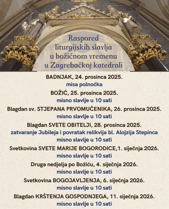 Također, na svetkovinu Bogojavljenja, Sveta Tri kralja, u utorak 6. siječnja 2026. godine, nadbiskup Kutleša predvodit će misno slavlje s početkom u 10 sati u Zagrebačkoj katedrali. Pored Zagrebačke katedrale, nadbiskup u miru kardinal Josip Bozanić će na Badnjak predvoditi misu bdjenja u Bogoslužnom prostoru blaženog Alojzija Stepinca (Kaptol 28), s početkom u 18 sati.