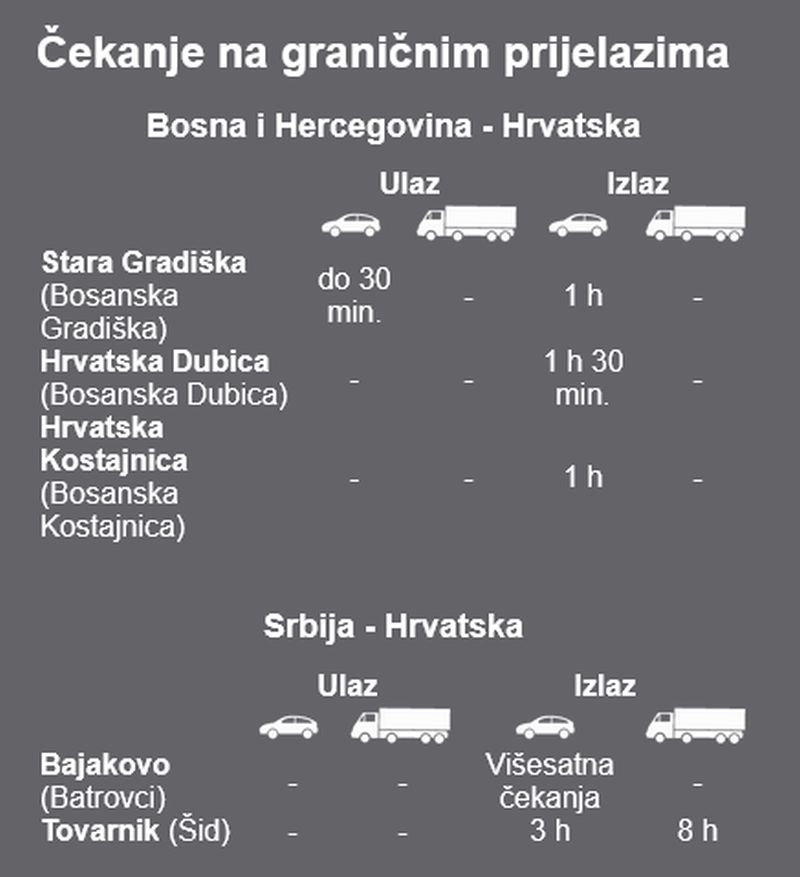 Na A3 Bregana-Lipovac (uključujući zagrebačku obilaznicu): kolona između čvora Jakuševec i naplatne postaje Lučko u smjeru mora duga je oko 4 km; kolona osobnih i teretnih vozila pred GP Bajakovo u smjeru Srbije je oko 10 km; prometna nesreća između čvora Slavonski Brod istok i čvora Sredanci (na 235+000 km) u smjeru Lipovca, vozi se jednim prometnim trakom, kolona je oko 4 km, javlja HAK.