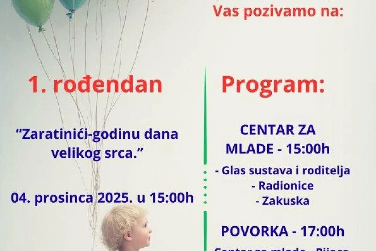 Udruga Zaratinići, koju čine roditelji djece i mladih s teškoćama u razvoju, u četvrtak, 4. prosinca, obilježit će svoju prvu godinu djelovanja. Svečanost će se održati u Centru za mlade Zadar, s početkom u 15 sati.