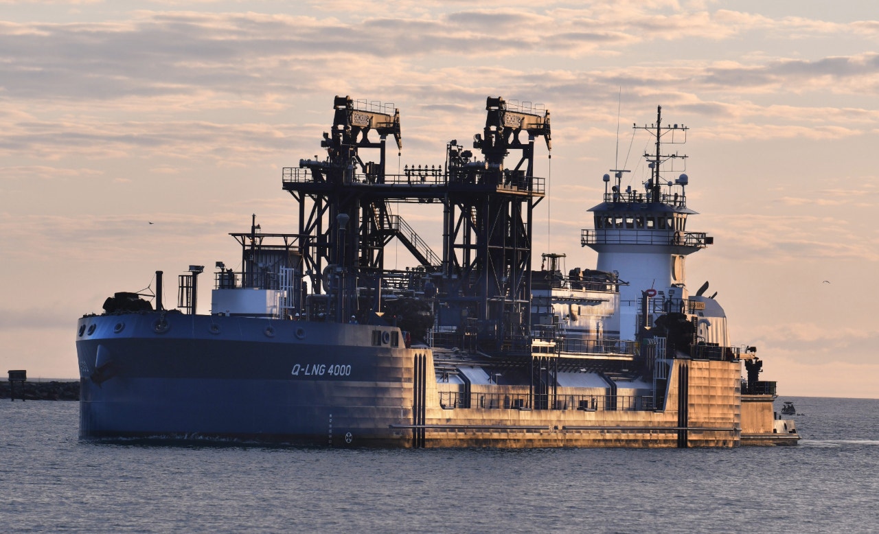 LNG tanker nakrcan ukapljenim prirodnim plinom usidren je na plutajućem terminalu u Wilhelmshavenu, Njemačka, 2023. godine. (Sina Schuldt/dpa putem AP-a)
