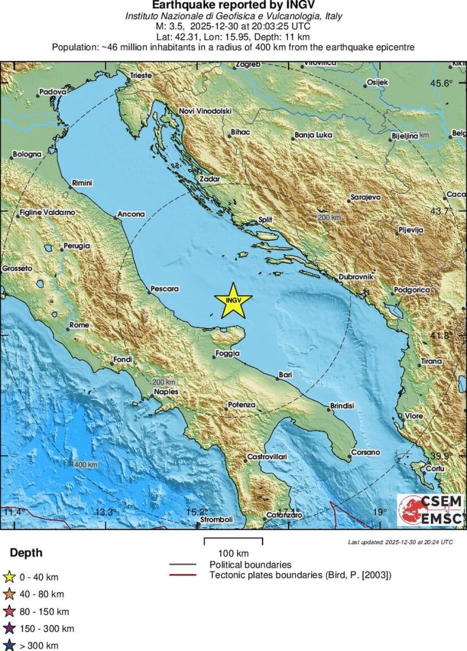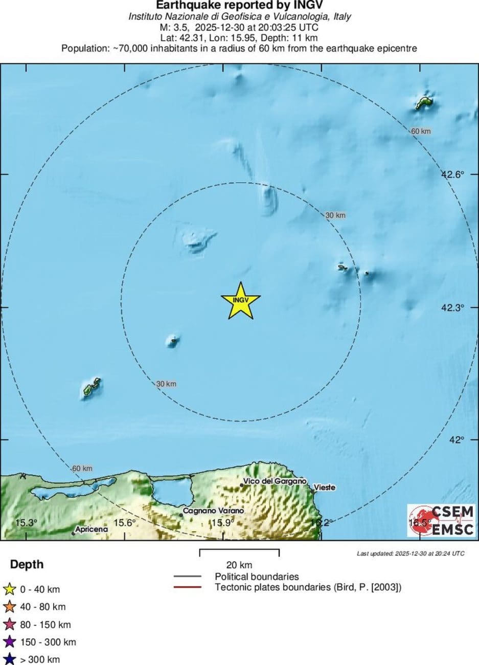 Prema podacima EMSC-a, epicentar je bio u srednjom Jadranu između Palagruže i talijanskog poluotoka Gargano, 51 kilometara sjeverozapadno od grada Vieste.
