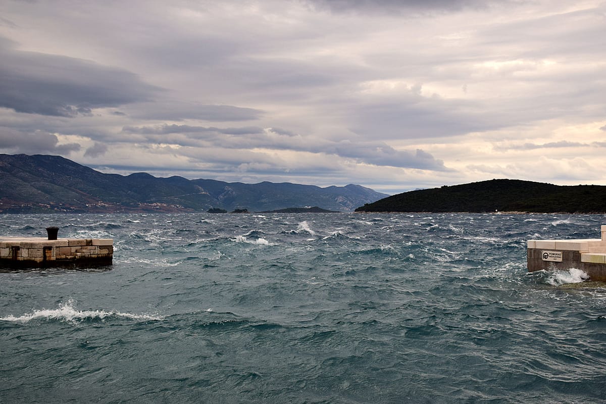 Mjestimice udari bure i sjevernog, na otvorenom moru i sjeverozapadnog vjetra, na južnom i dijelu srednjeg Jadrana udari juga i jugozapadnog vjetra u jačanju na 35-60, podno Velebita do 70 čvorova. Sutra tijekom dana na otvorenom srednjeg i dijela sjevernog Jadrana moguće more 5. Ponegdje su moguće izraženije nevere.