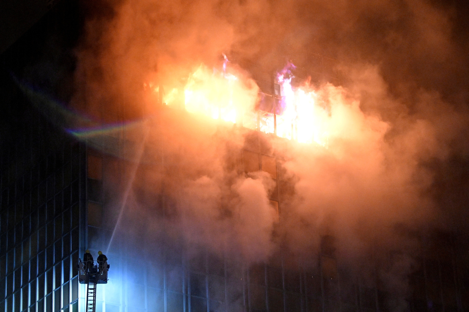 Ubrzo nakon početka intervencije požar se proširio na sve katove od 5. naviše, zbog čega su vatrogasci morali hitno napustiti objekt i prijeći na vanjsko gašenje. Vanjsko gašenje je bilo otežano zbog pada stakla i dijelova konstrukcije s viših katova.