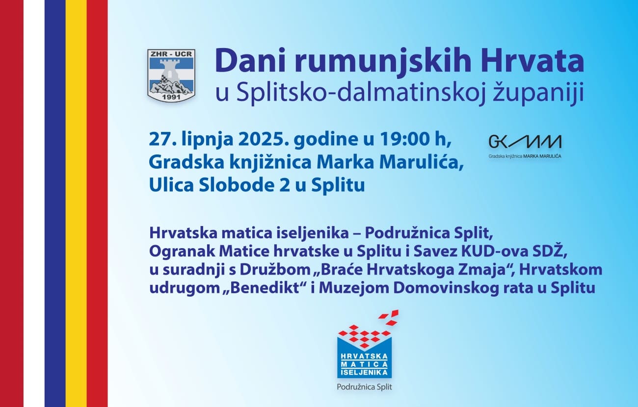 Večeras, 27. lipnja s početkom u 19 sati, u Gradskoj knjižnici Marka Marulića u Splitu (Ulica Slobode 2) održava se kulturna manifestacija “Dani rumunjskih Hrvata u Splitsko-dalmatinskoj županiji”, koja će publici približiti bogatu baštinu i identitet hrvatske zajednice u Rumunjskoj.