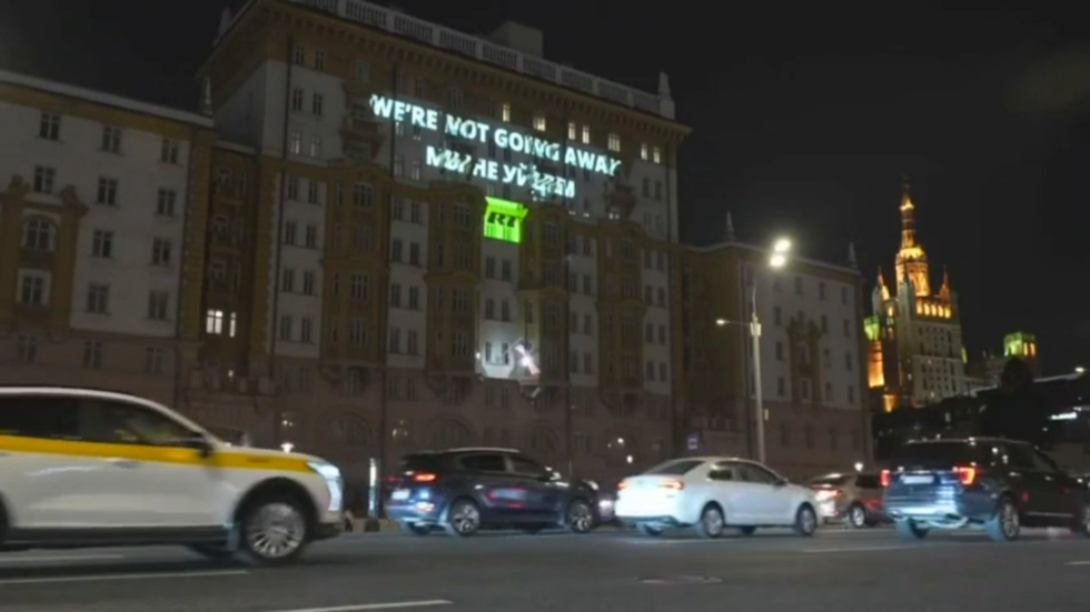 Pročelje američkog veleposlanstva u Moskvi osvijetljeno je prkosnom porukom RT-a u četvrtak navečer, jer je ruski emiter obavijestio Amerikance da je “ne odlazi.”